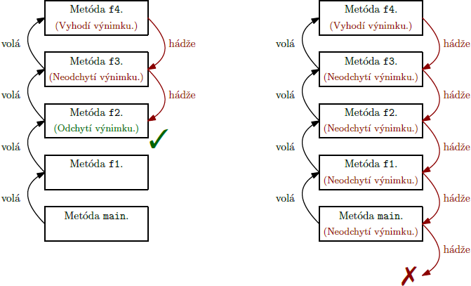 gsa na celú situáciu dá pozerať tak, akoby výnimka vznikla pri vykonávaní príkazu, v rámci ktorého sa volala metódaf. Opäť teda môže byť výnimka buď odchytená a ošetrená, alebo rovnakým spôsobom predaná metóde, ktorá volala metódug(aj v takom prípade hovoríme, že metódagvyhodila výnimku, hoci reálne výnimka vznikla už v metódef). - Takto sa v zásobníku volaní metód pokračuje nižšie a nižšie, až kým je nájdená metóda, ktorá danú výnimku odchytí a spracuje.